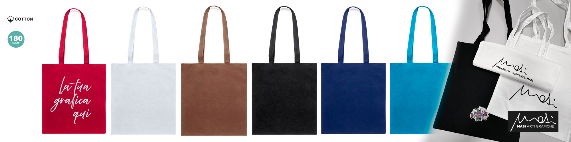 Shopper realizzata in cotone 180g/m2. Finiture cucite e manici lunghi rinforzati (70x2,5 cm). Disponibile in una ampia gamma di colori. Resistenza fino a 10 kg di peso. Formato 36x40 cm. Personalizzabile con logo e grafica a colori, argento, oro, o anche a un colore a scelta. Stampa su un lato o su entrambi i lati. Per maggiorni informazioni invia una richiesta, forniremo un preventivo dettagliato.